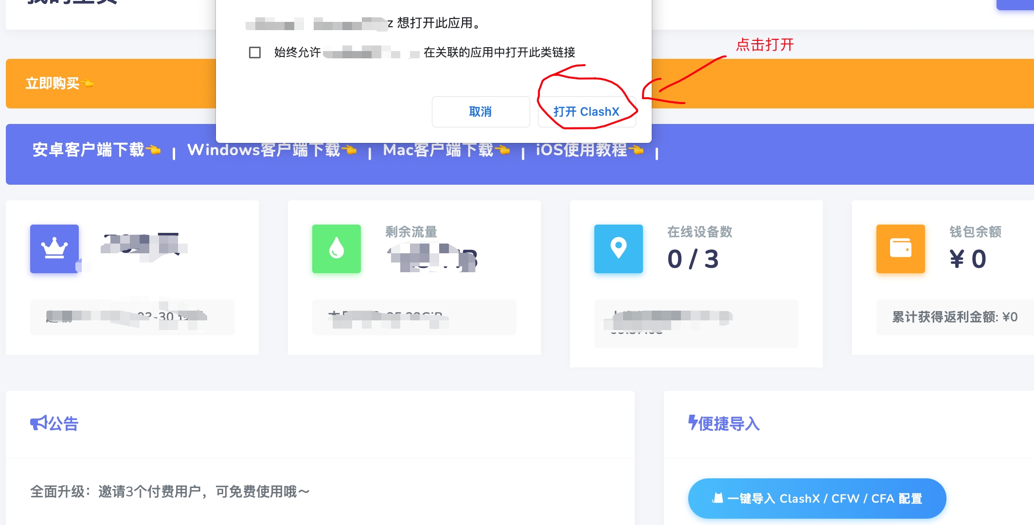 打开官网 -> 登陆个人账号 -> 个人主页右下边(便捷导入)->点击 导入Clash订阅
