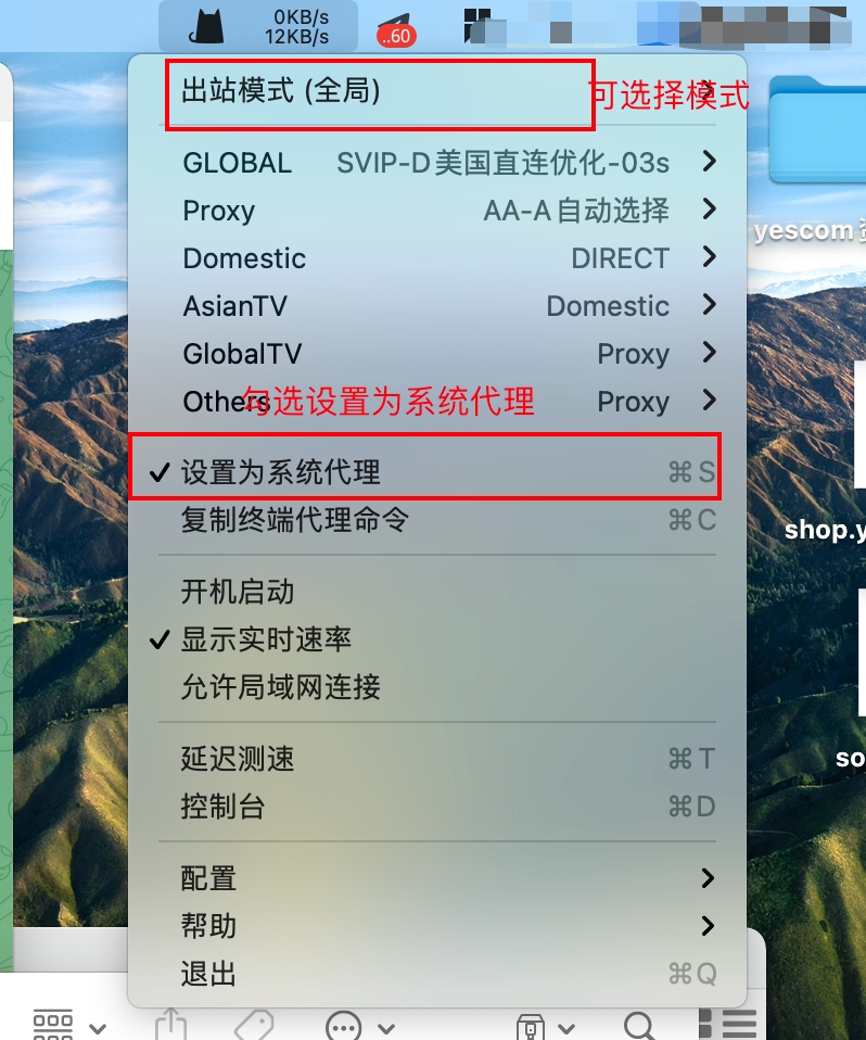 设置为系统代理 : 软件的开关. 打钩就是开, 不打钩就关.