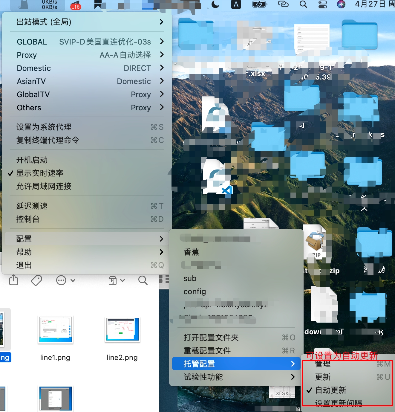 1.不要勾选"设置为系统代理" 2.点击'配置' -> '托管配置' -> '更新'