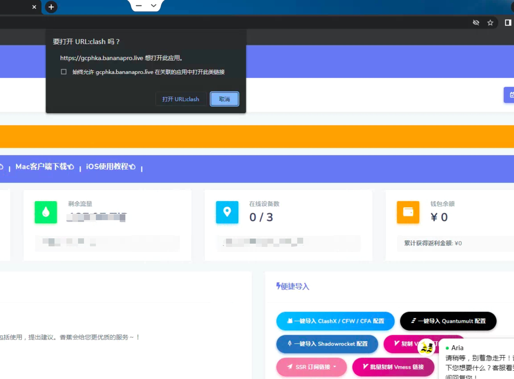 打开官网 -> 登陆个人账号 -> 个人主页右下边(便捷导入)->点击一键导入 导入Clash订阅